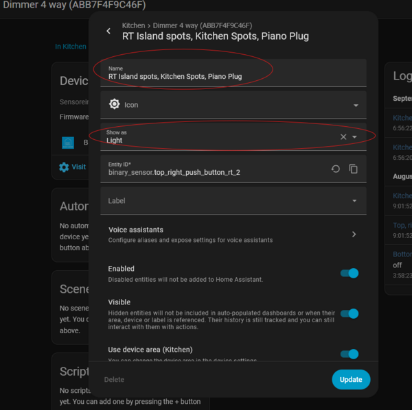 For naming, you don't need the type of sensor, serial or room location because they are already part of the above lying information. Because this is a 4 way sensor, I insert the button location and what lights they activate.