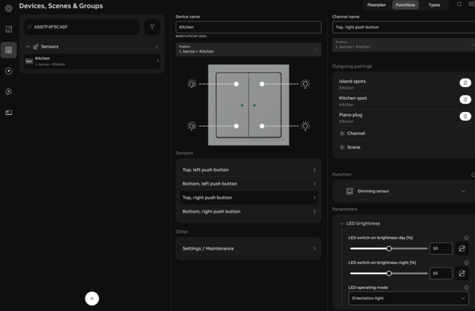 To find what buttons on the switches / controllers do what, look up the serial number of the device in the Free@home dashboard.