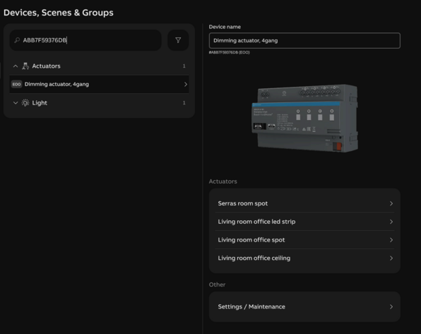 When you first import the devices, all the names have the device Serial numbers in the name. I recommend that when renaming devices, you copy paste the serial number so that you can find them easily in the Free@home dashboard. The actuators themselves (eg Dimmaktors, heating controllers / heizungaktor), etc I put in the Utility Room, because they can actuate the input from switches / controllers in multiple rooms.